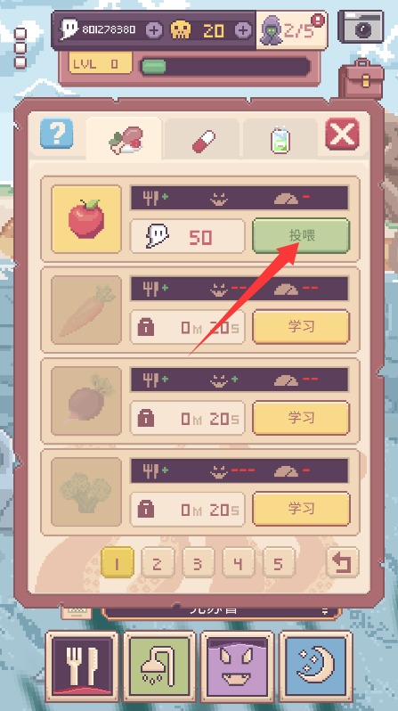 4、最后点击食物图标完成喂食动作过程,看着宠物享用美味提升彼此亲密度。