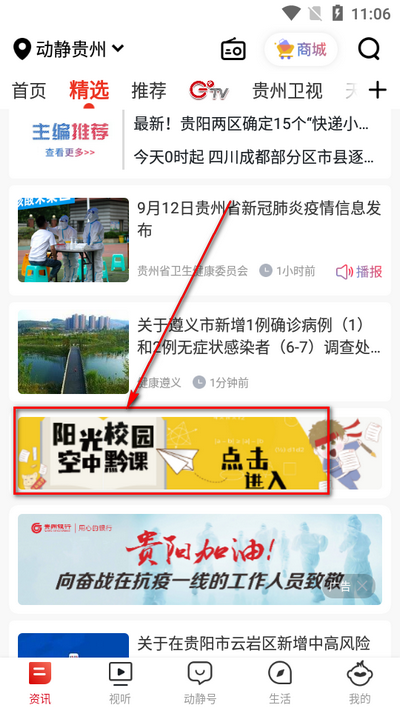 1、在本页面下载最新客户端,启动APP进入精选页面,点击进入“阳光校园·空中黔课”专区,选择需要收看的课程即可收看。