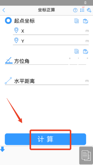 1、坐标计算操作,打开坐标计算功能,依次输入起点的已知坐标、方位角与水平距离,点击计算即可快速获得终点的精确坐标数据。